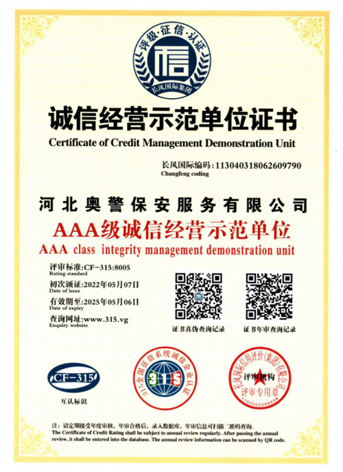 奧警邯鄲保安公司是一家民營保安服務(wù)公司,工商行政管理局登記注冊,獲取相關(guān)等級資質(zhì)證書,是一家大型的保安連鎖服務(wù)公司。